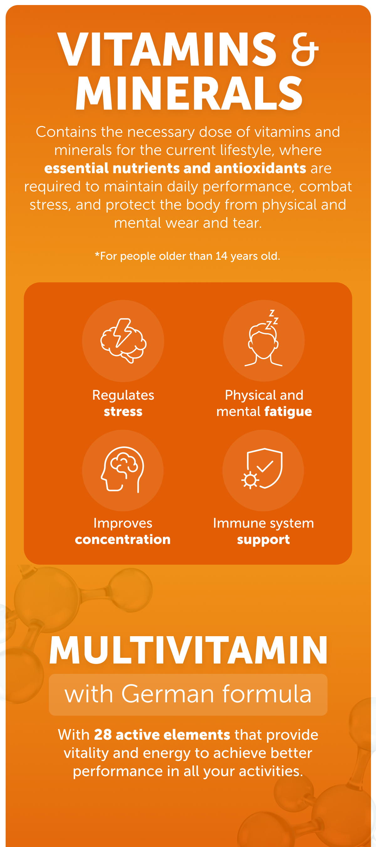 Vivioptal Multi is a German formulated multivitamin with 28 ingredients that provides vitality and energy to improve your overall daily performance, fights stress, and protects the body from physical and mental wear and tear. †