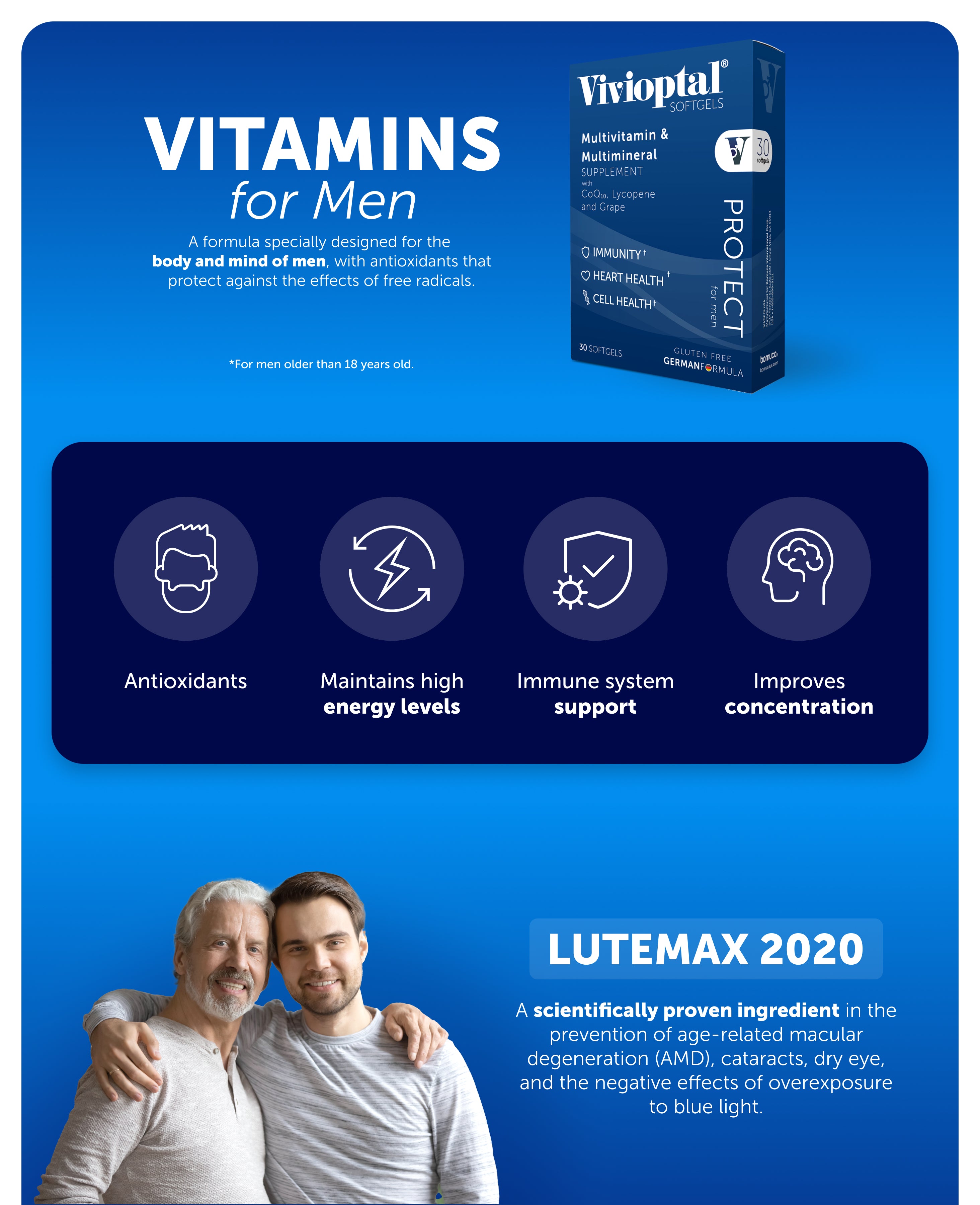 Vivioptal Protect for Men is a formula designed specifically for the mind and body of men. With antioxidants that protect against free radicals and ingredients that enhance mental performance.