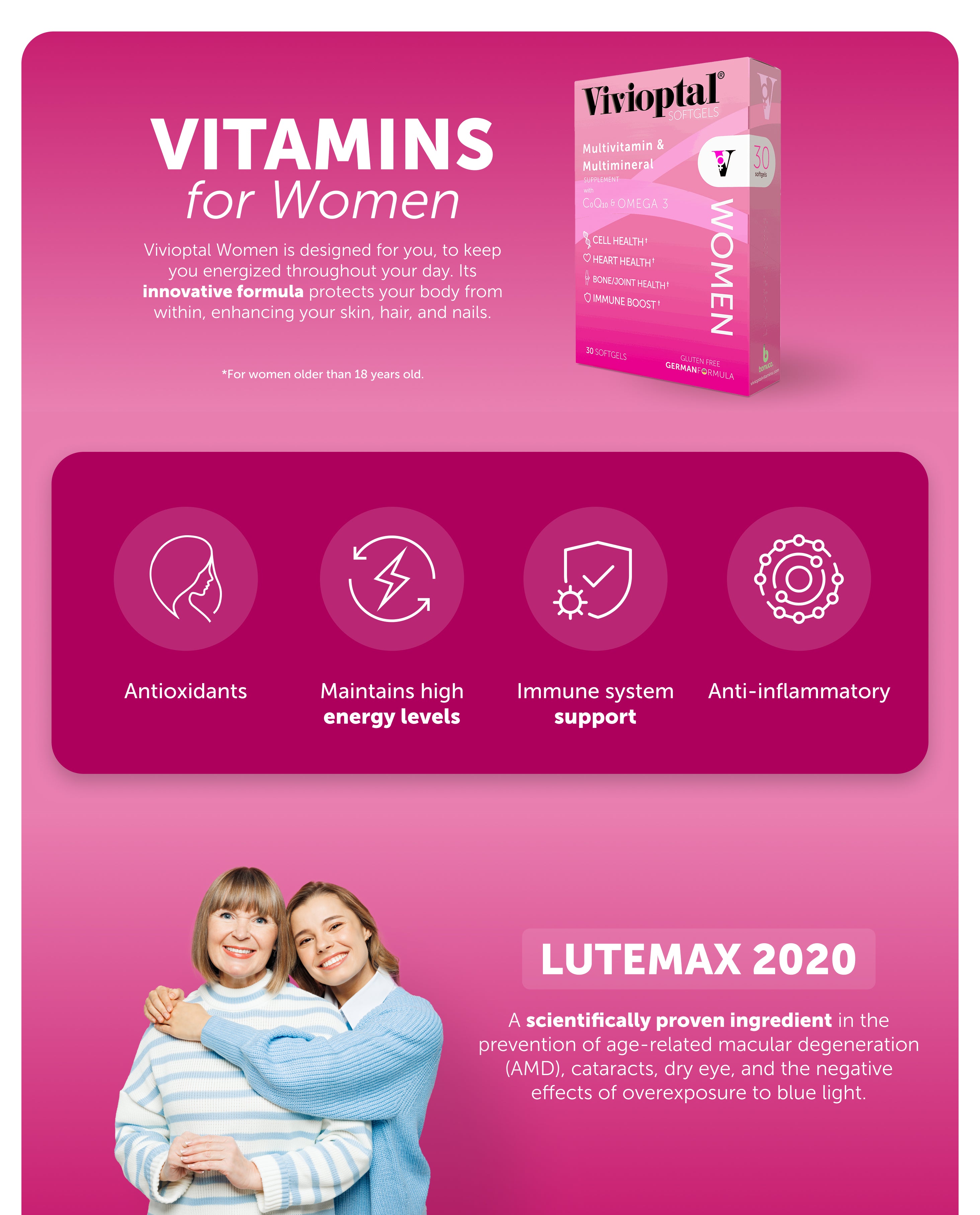 Vivioptal Women is specifically tailored to keep you powered through the day. Its innovative formula protects your body from within and improves your skin, hair, and nails.