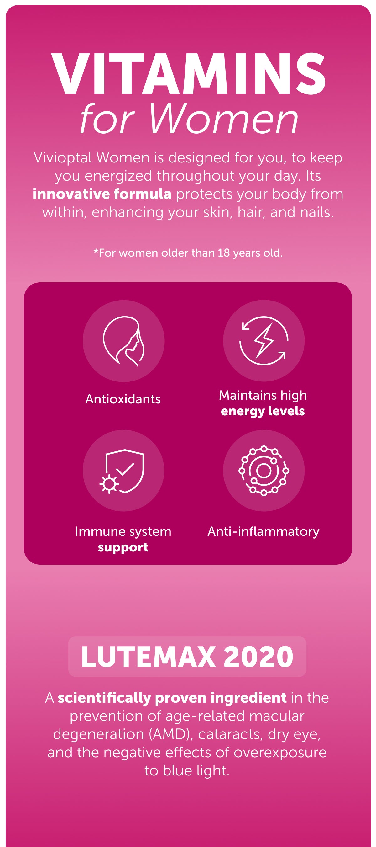 Vivioptal Women is specifically tailored to keep you powered through the day. Its innovative formula protects your body from within and improves your skin, hair, and nails.